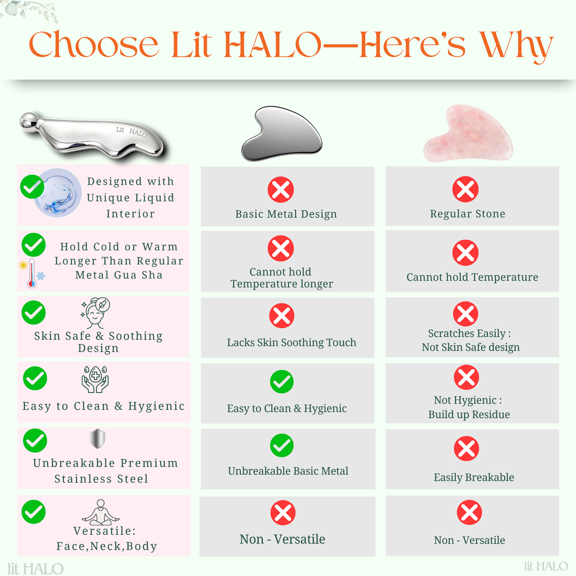 Lit Halo Stainless Steel Cryo-Thermal Gua Sha with 360° Roller: Redefining skincare with an advanced 4-in-1 design. Made from premium stainless steel, this innovative tool combines the ancient art of gua sha with modern cryo-thermal technology and a 360° eye roller. Enjoy the ultimate blend of Cryo and Thermal benefits for a next-level skincare experience.